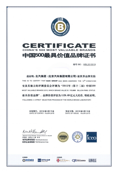 6月16 日,國際權威品牌研究機構“世界品牌實驗室”在京發布2015年(第十二屆)《中國500 最具價值品牌》排行榜,北汽集團憑借1126.69 億元品牌價值位列排行榜第19 位,相較去年品牌價值(986.75 億元)增長14.2% ,穩居中國最具價值汽車企業前三強,同時位居北京市屬企業首位。